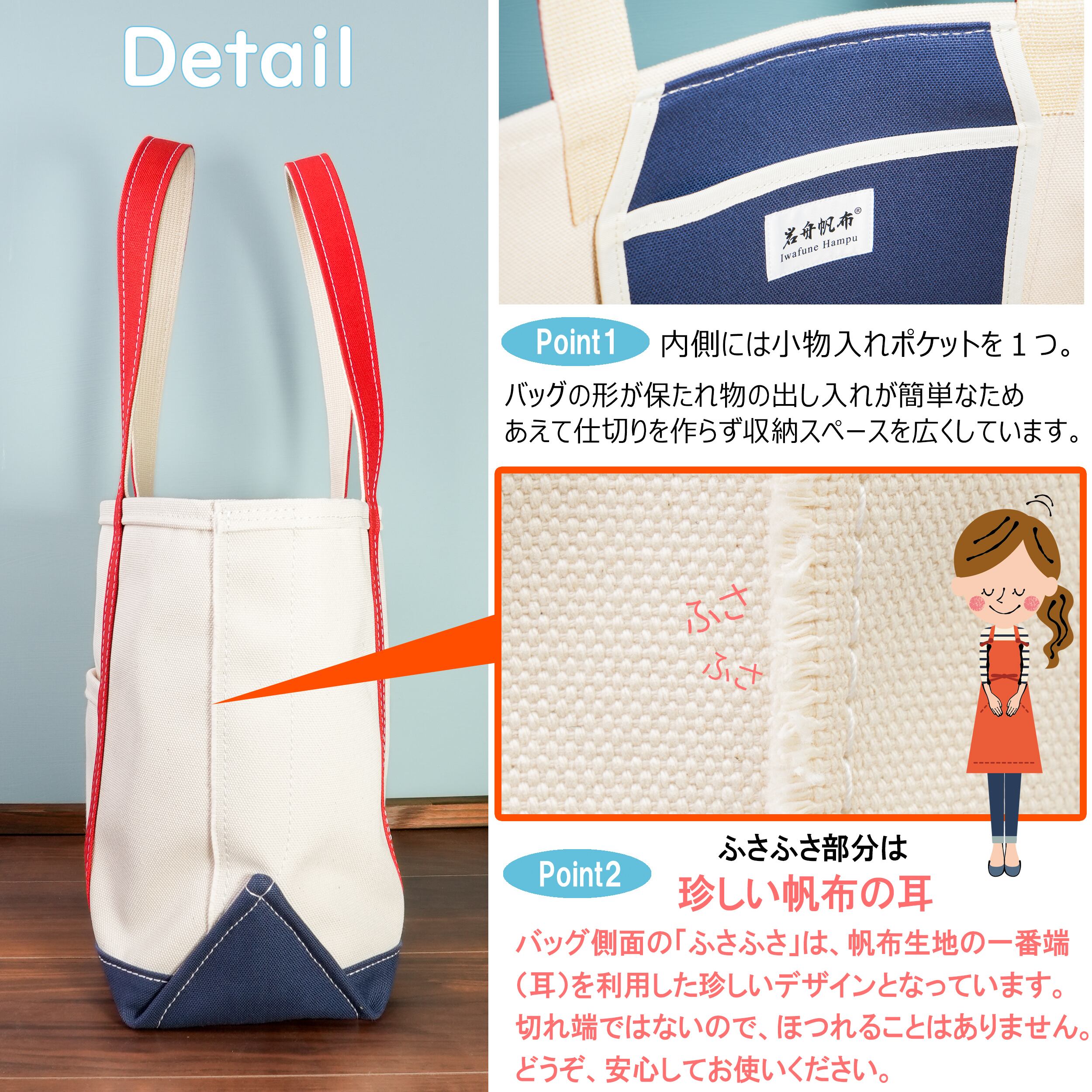 帆布は国産の『富士金梅』24オンス=4号帆布を使用し、持ち手と底には8号帆布を使用しています。