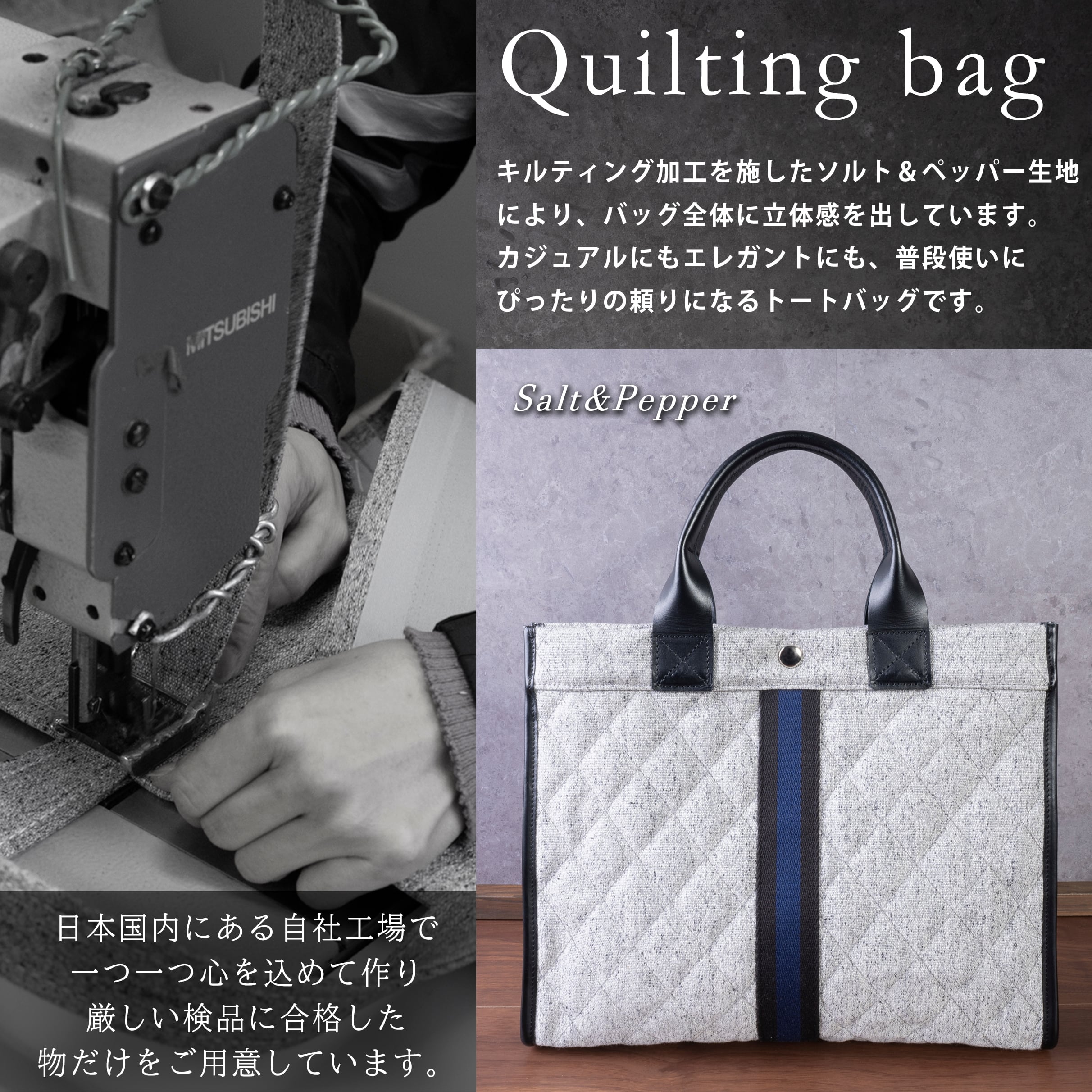 ソルト&ペッパーの帆布生地にキルティング加工を施し、生地に立体感を出しています。