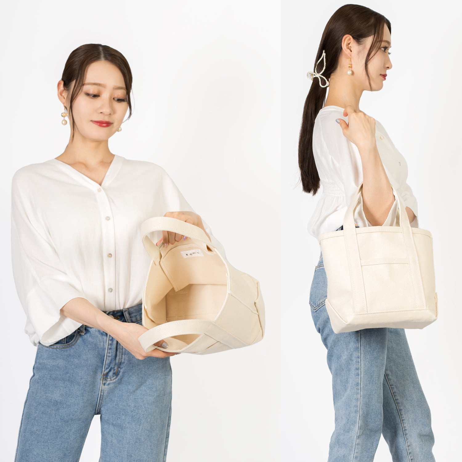 裏地や芯材を使用しなくても自立し、置いてもきれいな姿を保つトートバッグとなります。