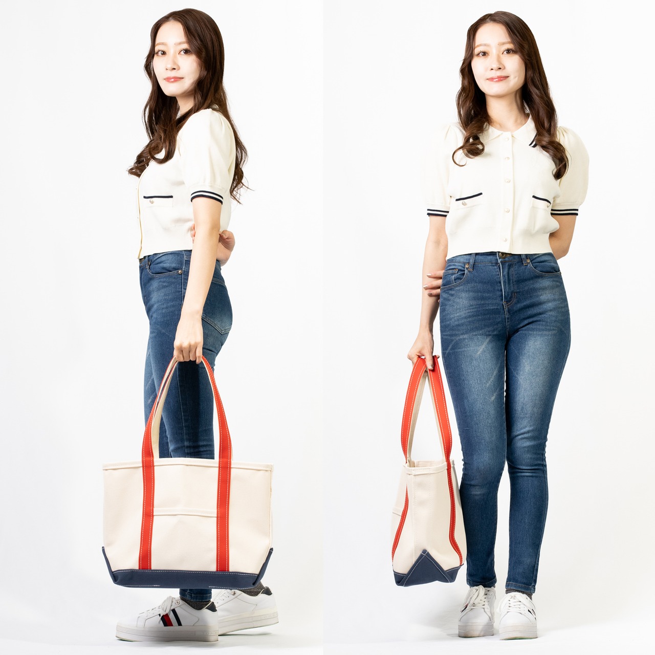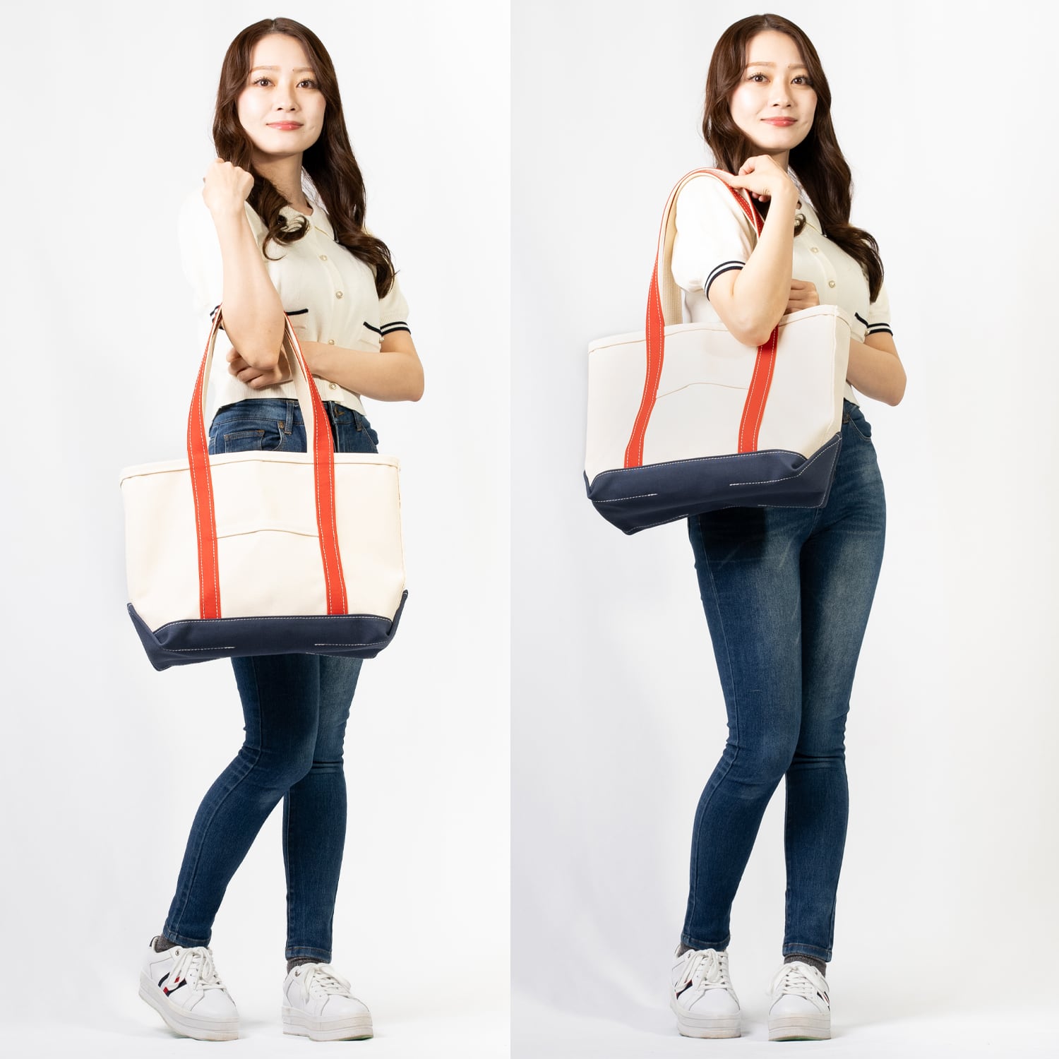 【日本製】帆布 キャンバス ロングハンドル トートバッグ Mサイズ Ship and Rock Basic tote 日本製 (オレンジレッド×ネイビーブルー)