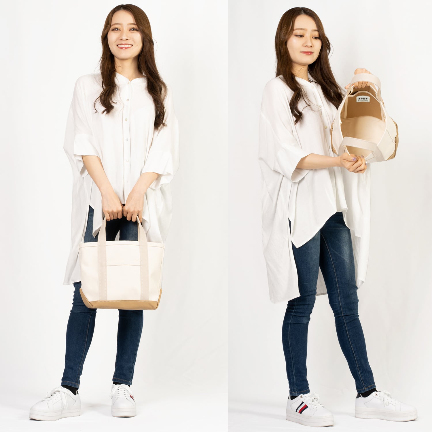 裏地や芯材を使用しなくても自立し、置いてもきれいな姿を保つトートバッグとなります。