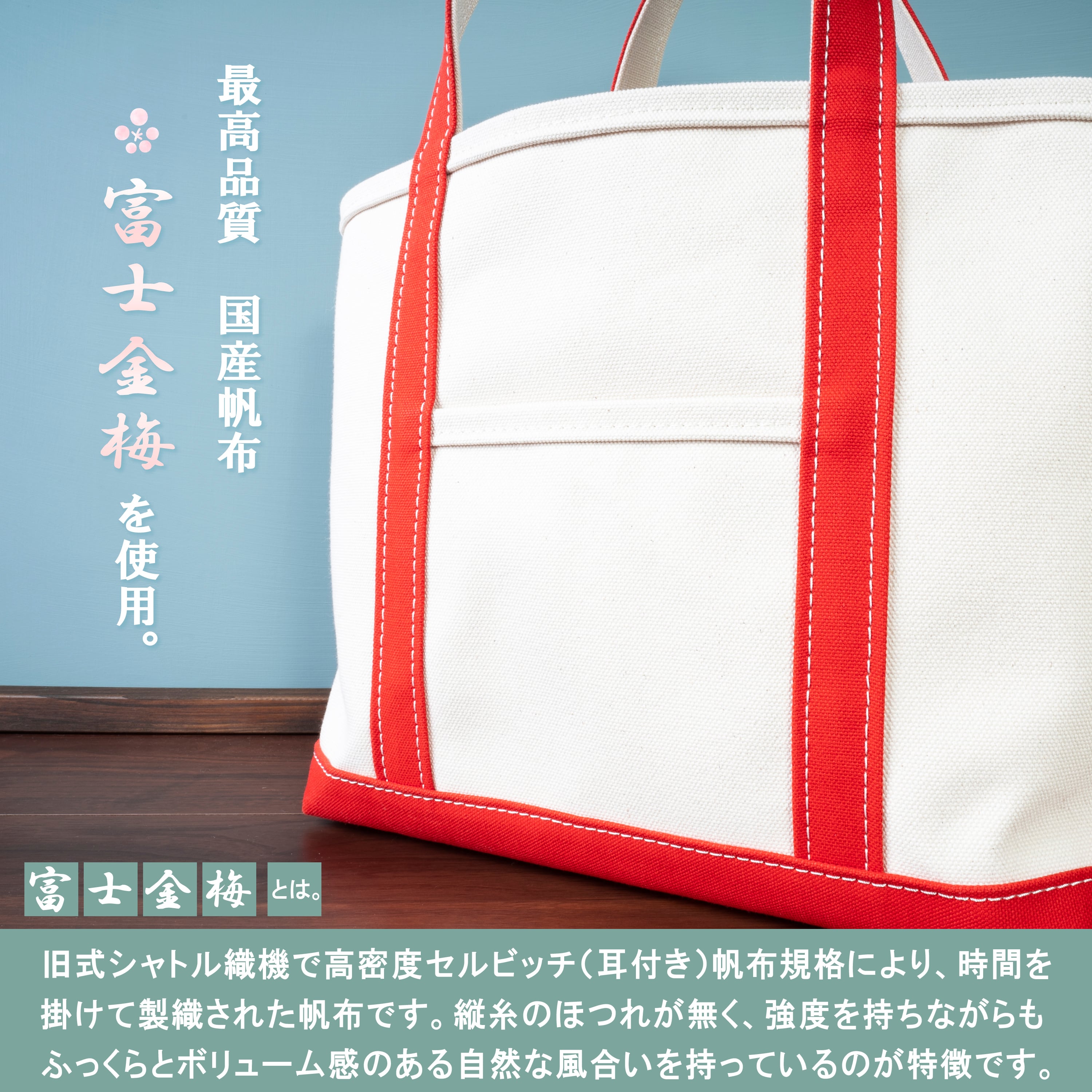 帆布は国産の『富士金梅』24オンス=4号帆布を使用し、持ち手と底には8号帆布を使用しています。