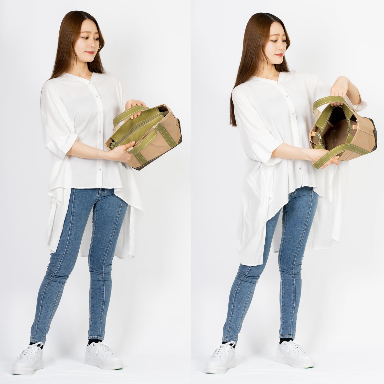 特注のYKKファスナーを使用した、蓋つきのトートバッグに仕上げました。 スムーズに開閉が行えます。 こちらのバッグは形がしっかりと保たれるため、物がどこにあるのか把握しやすく、サッと取り出せます。そのため敢えて仕切りを作らず、たくさんのアイテムがゆったりと入るようにデザイン致しました。