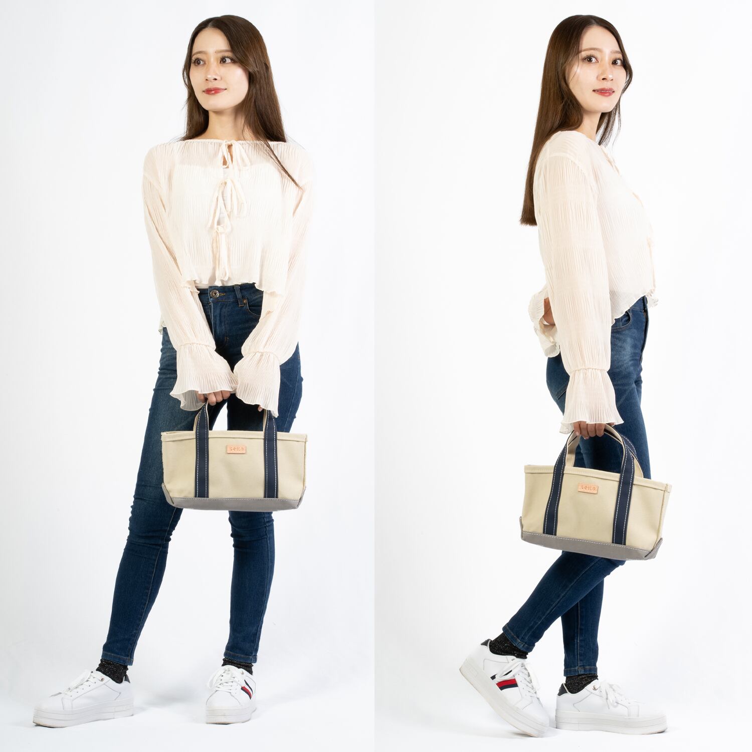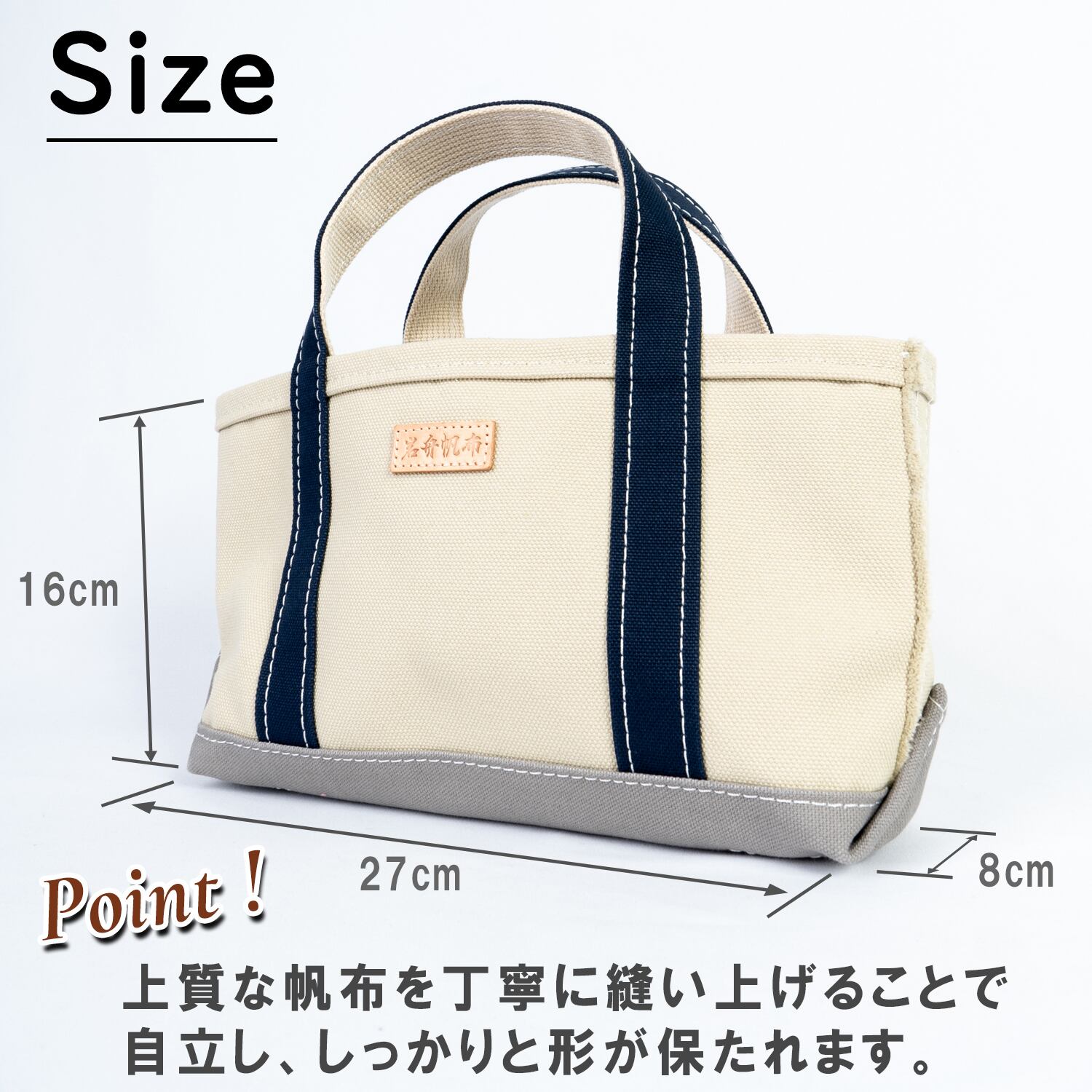 バッグ サイズ:ミニサイズ 約縦16cm×横(底幅)27cm×マチ8cm 持ち手9cm 重量:約 250g 帆布 (キャンバス):綿100% 商品画像内のモデル身長:158cm